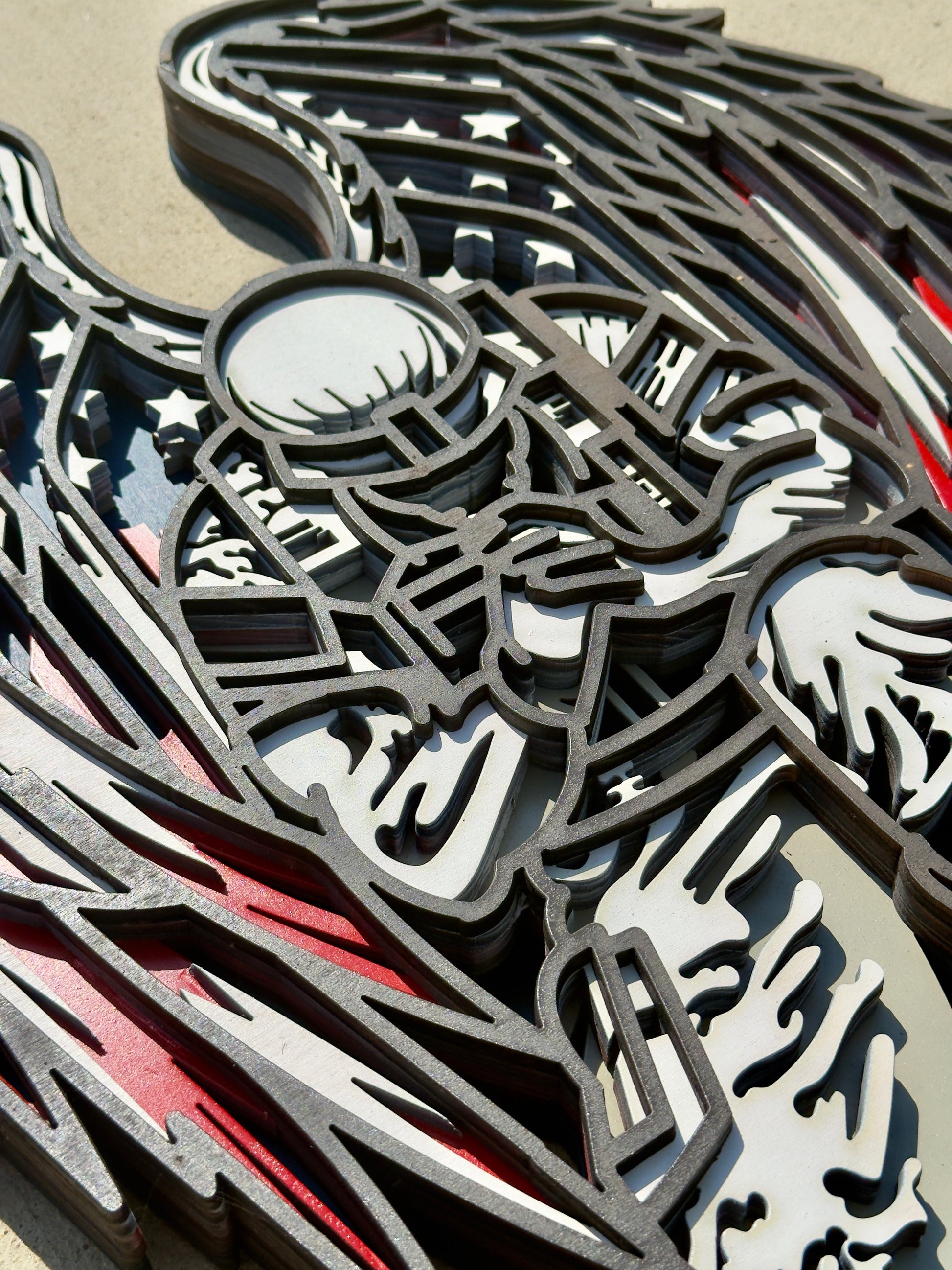 Material: Precision-cut wood layers, hand-painted red, white, blue, and charcoal tones